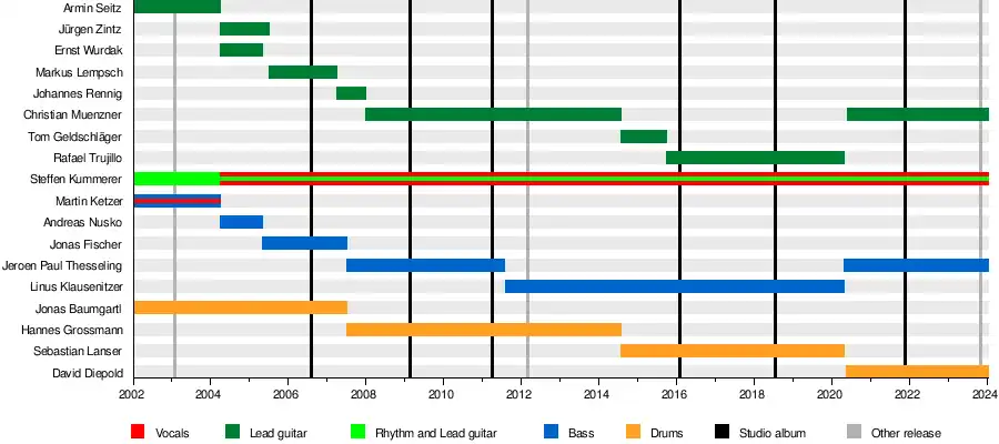 In 2014, guitarist Christian Münzner left the band due to creative differences and his inability to tour as a result of his focal dystonia muscle spasms.[14] Additionally, Hannes Grossmann left at the same time, citing his own interests in forming a separate band.[14] Obscura then hired guitarist Tom Geldschläger and fusion drummer Sebastian Lanser of German jazz metal group Panzerballett.[15] Obscura was scheduled to tour the US with the new line up as a part of the 2015 Summer Slaughter Tour, but despite early applications for visas they were unable to perform. Prior to releasing the band's fourth record Akroasis Obscura announced Munich Guitar Institute graduate Rafael Trujillo as their new permanent lead guitarist, replacing Geldschläger who was released from his duties by Kummerer as of July 2015.