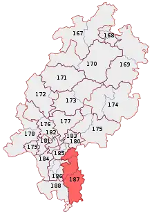 Odenwald is an electoral constituency (German: Wahlkreis) represented in the Bundestag. It elects one member via first-past-the-post voting. Under the current constituency numbering system, it is designated as constituency 187. It is located in southern Hesse, comprising the district of Odenwaldkreis and eastern parts of the districts of Darmstadt-Dieburg and Landkreis Offenbach.[1]