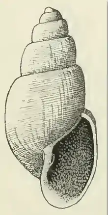The elongate-ovate shell is turreted, narrowly umbilicated, and creamy-white. The nuclear whorls are small, obliquely immersed in the first of the succeeding turns, above which only the tilted edge of the last volution projects. The five post-nuclear whorls are rather high between the sutures, shouldered at the summit, almost flattened below the shoulder. The spaces between the shoulders and the sutures appear as cylindrical elements. The whorls are marked by rather strong, incremental lines and by numerous strong, wavy, incised, spiral striations. The periphery and the moderately long base of the body whorl are well rounded, marked like the spire. The oval aperture is large. The posterior angle is decidedly obtuse. The outer lip is thin. The inner lip is moderately strong, oblique, somewhat sinuous, slightly reflected, and provided with a fold some little distance anterior to its insertion. The parietal wall is glazed with a moderately thick callus.[3]