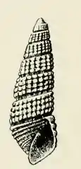 The elongate-conic, slender shell is vitreous. It measures 2.5 mm. The two and one-half nuclear whorls form a depressed helicoid spire, whose axis is almost at right angles to that of the succeeding turns, in the first of which it is about one-half immersed. The seven post-nuclear whorls are very slightly rounded, strongly constricted at the sutures and prominently shouldered at the summit. They are marked by well rounded, tuberculate, axial ribs, of which 14 occur upon the first and second, 16 upon the third, 18 upon the fourth and fifth, and 24 upon the penultimate turn. In addition to the axial ribs, the whorls are marked between the sutures by four spiral cords which equal the ribs in strength, and render them tuberculate at their junction. The sutures are broadly and deeply channeled. The periphery and the somewhat prolonged base of the body whorl are well rounded, the latter marked by seven narrow, almost equal, and equally spaced spiral keels, the broad space between which and the peripheral sulcus are marked by many slender axial riblets. The aperture is oval. The outer lip is thin, showing the external sculpture within. The columella is stout, slightly curved, strongly reflected over the reinforcing base, provided with a strong fold at its insertion.[4]
