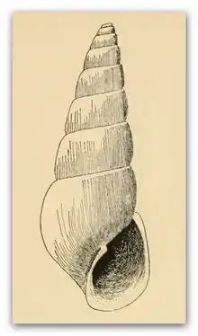The milk-white shell has a regularly elongate-conic shape. It measures 6.7 mm. The whorls of the protoconch are small, obliquely almost completely immersed in the first of the succeeding whorls, only the periphery of the last two being visible. The nine whorls of the teleoconch are rather high between the sutures, very slightly rounded, slightly angulated at the periphery and scarcely at all shouldered. They are marked by scarcely perceptible lines of growth, and here and there by a faint trace of some very fine microscopic spiral lines. The summit of succeeding whorls falls somewhat anterior to the periphery of the preceding turns, which gives a slightly constricted appearance at the well-impressed suture. The periphery of the body whorl is faintly angulated. The base of the shell is large, well rounded, narrowly umbilicated and somewhat effuse at the junction of the lip and columella. The posterior angle is acute. The outer lip is thin. The long columella is slender, almost straight, somewhat revolute, bearing a strong oblique fold near its insertion. The parietal wall is covered by a thin callus.[1]