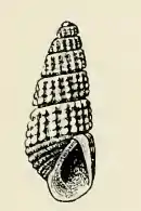 The elongate-conic shell is vitreous. It measures 2.8 mm. The whorls of the protoconch are small, smooth, and almost completely obliquely immersed in the first of the succeeding turns, above which only the tilted edge of the last volution projects. The six whorls of the teleoconch are flattened, strongly contracted at the sutures and moderately shouldered at the summit. They are marked by strong, tuberculate retractive axial ribs, of which 18 occur upon the first and second and 20 upon the remaining turns. In addition to these axial ribs the whorls are marked by four slender, spiral cords between the sutures, which pass over the axial ribs and render them tuberculate at their junction. The spaces enclosed by the ribs and cords are rectangular pits, which have their long axis parallel with the spiral cords. The sutures are channeled. The periphery of the body whorl is marked by a spiral groove. The base of the body whorl is well rounded, and marked by eight spiral cords which grow successively weaker and closer spaced from the periphery to the umbilical area. The wide grooves between the spiral cords are marked by slender, raised, axial threads, which correspond to the ribs on the spire. The aperture is ovate and somewhat effuse anteriorly. The posterior angle is obtuse. The outer lip is thin, showing the external markings within. The columella is stout, strongly reflected, and provided with a slender fold at its insertion. The parietal wall is covered by a strong callus.[4]