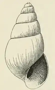 The shell is large and measures 5.2 mm. It is elongate-ovate, strongly umbilicated, yellowish-white. The nuclear whorls are deeply immersed in the first of the succeeding turns, above which the tilted edge of the last volution only projects. The six post-nuclear whorls are well rounded, and feebly shouldered at the summit. They are marked by fine incremental lines, and numerous exceedingly fine, closely spaced, spiral striations. The sutures are moderately constricted. The periphery of the body whorl is inflated, well rounded. The base of the shell is moderately long, well rounded, openly umbilicated. The aperture is oval, effuse anteriorly. The posterior angle is obtuse; The outer lip is thin. The inner lip is very oblique, slender, curved, and decidedly reflected, but not appressed to the base. The columella is provided with a moderately strong fold a little anterior to its insertion. The parietal wall is glazed with a thin callus.[3]