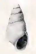 The bluish white shell is very small. Its length measures 2.2 mm. It has an elongate-ovate shape. The whorls of the protoconch are smooth, and deeply obliquely immersed in the first of the turns of the teleoconch above which the tilted edge of the last volution only projects. The spire of the protoconch is so obliquely placed that it gives the apex of the shell a truncated appearance. The 4.8 whorls of the teleoconch are very slightly rounded, and not appressed at the summit. They are marked by rather strong, and deeply incised spiral lines ; one a little heavier than the rest is situated a little below the summit and gives to this the appearance of being slightly keeled. In addition to this sculpture the whorls are marked by rather coarse lines of growth. The periphery of the body whorl is angulated. The base of the shell is short, well rounded, and lacks an umbilicus. It is marked by the continuation of the axial ribs and incised spiral lines which equal those on the spire in strength. The aperture is pear-shaped. The posterior angle is acute. The outer lip is thin. The columella is slightly curved, reflected over and appressed to the base for its posterior two-thirds. It is provided with a strong, oblique fold opposite the umbilical chink. The parietal wall is covered with a heavy callus.[1]