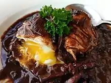 The dish is made with poached eggs accompanied by a meurette sauce/bourguignon sauce (made up of Burgundy red wine, bacon, onions and shallots browned in butter and[1] served with toasted garlic bread.