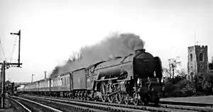 ECML express passing Offord & Buckden station and St Peter's Church in 1955