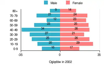According to the 2002 Poland census, there were 392 people residing in Oględów village, of whom 47.7% were male and 52.3% were female. In the village, the population was spread out, with 18.9% under the age of 18, 35.5% from 18 to 44, 21.7% from 45 to 64, and 24% who were 65 years of age or older.[1]