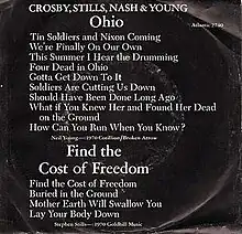 "Ohio" is a protest song and counterculture anthem written and composed by Neil Young in reaction to the Kent State shootings of May 4, 1970, and performed by Crosby, Stills, Nash & Young.[2] It was released as a single, backed with Stephen Stills's "Find the Cost of Freedom", peaking at number 14 on the US Billboard Hot 100 and number 16 in Canada.[3] Although live versions of "Ohio" and "Find the Cost of Freedom" were included on the group's 1971 double album 4 Way Street, the studio versions of both songs did not appear on an LP until the group's compilation So Far was released in 1974. The song also appeared on the Neil Young compilation albums Decade, released in 1977, and Greatest Hits, released in 2004.