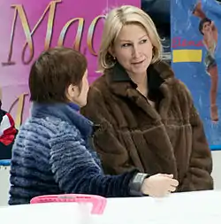 Kazakova teamed up with Artur Dmitriev in February 1995.[8] Dmitriev was much more experienced, having already competed at two Olympics with Natalia Mishkutenok and won two Olympic medals, gold in 1992 and silver in 1994. Although Mishkutenok decided to retire from competition in 1994, Dmitriev wanted to continue his competitive career and eventually chose Kazakova who also trained in Saint Petersburg.[8] Tamara Moskvina coached them at Yubileyny.[1] Their choreographers were Alexander Matveev, David Avdish, and Moskvina.[9] Early in their partnership, Kazakova and Dmitriev missed six months when she injured her leg.[8] They won the 1996 European Championships and bronze at the 1997 World Championships. In 1998, they won the Olympic title in Nagano, Japan. Kazakova said, "I wanted very much to prove myself and I did."[8] The pair retired from competition but continued to skate in shows.[6][10]