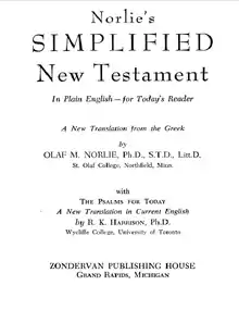 Today Norlie's best known work is his translation of the New Testament titled Simplified New Testament. He originally had John's Gospel published in 1943 as The Gospel of St. John: translated into modern English (published in Texas). Though he completed the entire New Testament in 1951, he could not initially find a publisher to print it. Finally in 1961, Zondervan published it. It was so positively received that there was a second printing in that same year. It was bound together with The Psalms For Today A New Translation in Current English, translated by R. K. Harrison.[9] The following is a sample from his Simplified New Testament, Romans 1:21-23: