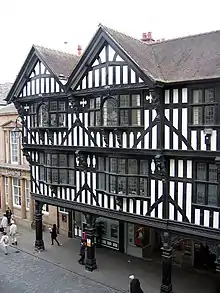 The buildings were designed by T. M. Lockwood and completed in 1895. They are built in brick with applied timber-framing and a tiled roof. The buildings are in three storeys with cellars, and have modern shop fronts in the ground floor. The first floor projects over the pavement and is carried on posts. The top floor and the two gables are jettied with decorative corbels. There is one casement window, the other windows being oriels. On the corner is a timber-framed turret with a cupola.[1][2] The buildings were initially used by Lloyds Bank[3] and by Williams Deacon's Bank.[4]