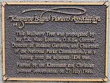The Kangaroo Island Pioneers Association commemorated in 1986 the planting of a progeny of the adjacent original mulberry tree, by the Christian and Kleeman pioneer family descendants.