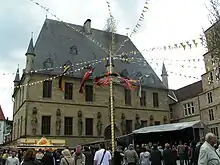The historical Christmas market has a long tradition in Osnabrück. The market is placed in front of the cathedral and on the market place and lasts approximately four week, starting in the end of November and ending just before Christmas. On numerous stands are foods, drinks or decoration sold and small Ferris wheels are built up for children. From 12 to 21 a clock is the market daily opened and warm drinks like hot chocolate or mulled wine are sold to the people.[11]