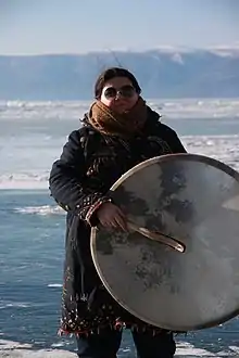 Olesya Rostovskaya is playing a shaman's drum on ice of Baikal lake