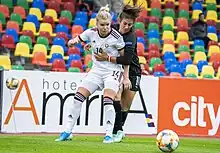 Ševcova did not play in the 2015 season, as she was pregnant.[8] Following the birth of her child, she returned to Latvian Women's League football with Rīgas FS in 2016.[3] After helping Rīgas FS to a "double" in 2017, Ševcova was named Latvian Footballer of the Year for a third time.[1] Continued good form saw her retain the award in 2018 and 2019.[9] In 2019 she was one of several players to depart the dominant Rīgas FS club for newly-formed FK Dinamo Rīga,[10] who then captured the Latvian Women's League title.[11]