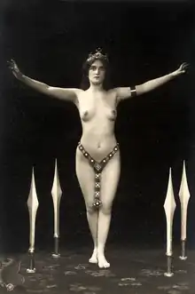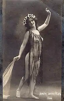 In Berlin, she co-founded the Association for Ideal Culture and gave shows called "living pictures" in which she posed after the manner of ancient classical works of art. Upon returning to Berlin, she changed her name to Olga Desmond, working with Adolf Salge.[1][5] She began to create her own show, and would dance with a veil. Eventually she switched to a long mediaeval-style belt.[4] The more she posed, the more she realized that she wanted to move on stage. She wanted to bring nudity to life.[6] These so-called "Evenings of Beauty" (Schönheitsabende) were prohibited on more than one occasion starting from 1908, because the actors usually posed nude or wearing only bodypaint.[7][8] She defended them by comparing them with the classical Greek ideal of nudity.[9] Variety reported in 1909 that she had been ordered to cover up when performing at the Crystal Palace, Leipzig, where she was earning $200 per night, but the police in Frankfurt did not stop her performing there.[10] She also introduced solo dances between the tableaux[4] and a new performance piece, Der Schwertertanz [Sword Dance] performed between two upward pointed spearheads set on the stage floor. This led to invitations to appear around Germany and in St Petersburg.[4]
