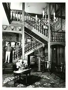 The flooring, doors and architraves are made of English oak and West Australian jarrah.[9][3] New Zealand kauri was used to construct the kitchen cupboards, dresser, and tables.[3] The oak stairs and gallery were made by joiners Green and Abbott in London, and then assembled on site, using no nails.[9] The printed hessian wallpaper in the hall was made by Turnbull and Stockdale of Lancashire, based on a Renaissance acanthus-leaf design.[3] The dining-room and library wallpaper were made by Birge and Co of Buffalo, New York. Stained-glass windows were provided by London firms Bryans and Webb, and G. F. Malins.[3] The drawing room contains the only decorated ceiling in the house.[3]