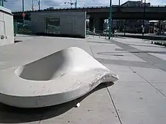 Outside the station is a sculpture by Marie Khouri, "Le Banc" or "The Bench", intended to double as a bench for people to sit in. Soon after the Canada Line opened, the sculpture was disfigured by skateboarders who used it as a ramp. The work was repaired by Khouri at her own expense.[6]