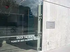Sign warning against skateboarding and biking on sculpture