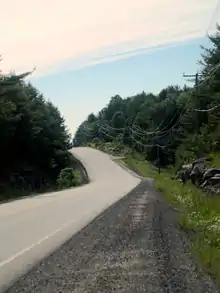 The road east of Carnarvon to Haliburton incorporates portions of the Peterson Road to West Guilford, and the North West Road thereafter. These two colonization roads were assumed by the DHO in 1956 as Highway 530 and a portion of Highway 519.[17][11] That year also saw the creation of Highway 121 between Fenelon Falls and Tory Hill via Minden and Haliburton.[11] To the east, the discovery of uranium deposits near Cardiff in 1952 resulted in a large mining boom for the Bancroft area. As a result, the DHO began constructing a new highway in 1956 which would connect the mines with Highway 28.[18] This new road would open as Highway 109 in 1958, connecting Highway 500 northeast of Tory Hill with Highway 28 at Paudash; the road was paved in 1961.[19] On March 1, 1964, several highways were renumbered in the Bancroft area. Highway 121 was extended from Tory Hill to Paudash via Highway 500 and Highway 109 as a result of this renumbering.[20]