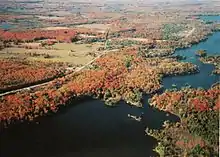North of Lindsay, Highway 35 travels near the Trent–Severn Waterway, tracing its route alongside Sturgeon Lake, Cameron Lake and Balsam Lake.[14] It passes over the first of several limestone cuestas near the Ken Reid Conservation Area as it approaches the boundary between the Ordovician limestone and the Precambrian Canadian Shield.[15][16] The route curves northeast and travels through farmland as well as the community of Cameron, before turning back northward at Powles Corners, where it intersects the southern end of former Highway 121 (now Kawartha Lakes Road 121). It continues north a short distance to intersect Kawartha Lakes Road 8, the eastern leg formerly being Highway 35A into Fenelon Falls.[5][17][18] The highway curves around the southern end of Cameron Lake near Isaacs Glen, travels north for a brief period then zig-zags northeast through Rosedale,[19] where it crosses the Trent–Severn on the Constable Randall F. Skidmore Bridge, named after a local police officer who was involved in a fatal crash nearby on February 14, 1986.[20] The farmland alongside the highway thins out north of Rosedale, as the route makes its approach to Coboconk.[5]