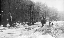 At the height of the Great Depression, work began in late 1931 between Coboconk and Dorset to build a new road.[35] The relief project employed upwards of 2,300 men, who resided in at least 13 temporary work camps. Work was done by hand in many places, with only dynamite and horses to aid construction along the rocky shorelines of lakes.[25][36] Construction wrapped up by the end of 1936, the final year before the jurisdiction of the DHO was extended north of the Trent–Severn Waterway.[25][37]