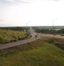 A long-standing issue through most of the history of Highway 9 is the Orangeville Bypass, the proposal for a route for trucks and other through traffic to bypass the central business district of Orangeville. In the 1960s, the Highway 10 bypass was constructed. At the same time, Highway 9 was rerouted from its straight route to meet the new bypass, creating Buena Vista Drive as a result. Starting in 1978, numerous plans were formulated for a southern bypass of Broadway, none of which came to fruition.[10][11] Orangeville eventually resorted to constructing the road themselves, completing several kilometres before local Member of Provincial Parliament and premier Ernie Eves contributed C$7 million of provincial funding to the project.[12] The 6.8 km (4.2 mi) bypass was finally opened to traffic on August 3, 2005.[13]