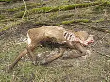Carcass of deer that had been shot because it was too weak to survive the winter