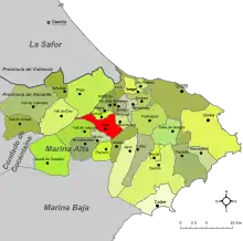 It is situated in the River Gerona valley[2] and is bordered by Pego to the north; Benidoleig and Ondara to the north-east; Jalón and Pedreguer to the east and Parcent and Alcalali to the south.