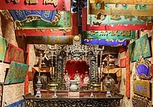 The oldest of the brick temples was completed in 1863 and is named Liet Sheng Kong which translated means "Temple of Many Gods and Goddesses".[3] In this temple visitors were allowed to worship any deity that they wishes to. The interior ceiling and walls of this building are covered with hanging boards with carvings or script to honored or thanking the Chinese deities for answering prayers. The room houses three altars. One teak altar at the front of the temple, brought to the temple from China, shows an elaborately carved courtyard scene, The second altar is used for supporting incense burners and the third (also from China) sits at the back wall of the temple. This altar support three carved, wooden statues representing Chinese deities. On the top sides of this altar there are 2 papier-mâché Southern lion heads employed by the Chinese to ward away evil spirits. These heads were also employed during Chinese festival parades in the area. Just inside of the temple there is a gong and just outside the temple's entry point there is a very large ceremonial urn which also originated from China.