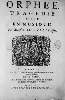 Orphée [ɔrfeə] (Orpheus) is an opera by the French composer Louis Lully, with contributions from his brother Jean-Baptiste Lully the Younger. It was first performed at the Académie Royale de Musique (the Paris Opera) on 21 February 1690. It takes the form of a tragédie en musique in three acts and a prologue. The libretto is by Michel Duboullay. This opera was created as a satirical response to Louis Lully's father's tragicomedie et ballet, "Ballet de Psyche," which proclaimed the greatness of King Louis XIV's power and the calm that occurred because of his reign. Louis Lully chose the story of Orpheus in relation to the monarch as a commentary on the villainous tendencies of his rule of France.