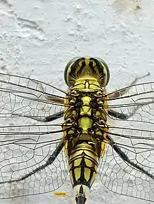 It is a medium-sized dragonfly with a wingspan of 60-85mm. Adults are grayish to greenish yellow with black and pale markings and green eyes. Its abdomen is greenish-yellow, marked with black.[8] It is very similar to Orthetrum serapia in appearance, with both species appearing in northern Australia. Pale markings on segment four of the abdomen do not extend into the posterior section when viewed from above on Orthetrum sabina. Females are similar to males in shape, color and size; differing only in sexual characteristics.[8][9] This dragonfly perches motionless on shrubs and dry twigs for long periods. It voraciously preys on smaller butterflies and dragonflies.[8][10][11][12]