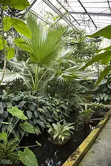 - Tropical greenhouse (built 1974) — Araceae, Arecaceae, Euphorbiaceae, Liliaceae, Marantaceae, and Pteridofitas.
