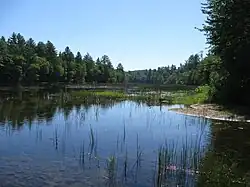 The Ossipee River begins at the village of Effingham Falls, New Hampshire, at the outlet of Berry Bay, the farthest downstream of a chain of lakes connected to Ossipee Lake. The river, flowing east, forms the border between the towns of Effingham and Freedom.[2] Entering Maine, the river continues to serve as a municipal boundary, first between Porter and Parsonsfield, and then between Hiram and Cornish. The river also forms the boundary between York County to the south and Oxford County to the north. Kezar Falls, a village in the town of Porter, forms a significant community along the river, with two dam impoundments.