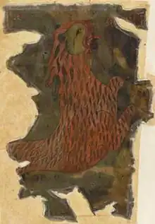In many of the insular gospels, such as the Lindisfarne Gospels, and the Book of Kells, each Gospel has an Evangelist portrait before the Gospel. In many other insular gospels, such as the Book of Durrow and the Echternach Gospels the portrait is replaced by a full page miniature of the Evangelist's symbol. Folio 27 recto (see illustration at left) in the British Library, which is one of the best preserved pages of this manuscript, contains the image of the lion of Mark. This page bears a remarkable stylistic similarity to the corresponding page in the Echternach Gospels, (see here) and gives a hint as to the quality of the manuscript before the fire.