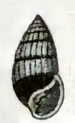 The white shell has a narrow chocolate band above and below the suture. The lower half of the body whorl is chocolate colored. The shell is longitudinally closely ribbed. The interstices are spirally striated. The length of shell varies between 8 mm and 15 mm.[2]