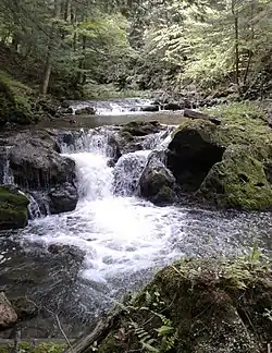 The source of the Otsquago Creek is about 12 miles southeast from its outlet, 1,360 feet above sea level and about 1,000 feet above the Mohawk River, in a marshy field by Van Hornesville, New York.[5] Creamery Falls and Van Hornesville Falls are two waterfalls on the creek near Van Hornesville.