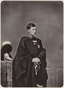 Otto was promoted to Captain on 27 April 1866 and entered active military service in the Royal Bavarian Infantry Guards. He participated in the Austro-Prussian War of 1866 and as colonel in the Franco-Prussian War of 1870–1871. His experiences on the battlefield traumatized him and caused him to have depression and insomnia.[4] When Wilhelm I was proclaimed German Emperor on 18 January 1871 at the Palace of Versailles, Prince Otto and his uncle, Luitpold, represented King Ludwig II, who refused to participate (despite having offered Wilhelm the Imperial title in a letter).[5][6] Otto then criticized the celebration as ostentatious and heartless in a letter to his brother. Otto despised his ambitious Prussian relatives and cordially disliked his Prussian mother and so they were appalled by the creation of the new German Empire. His hostility was no secret to the Prussian government.