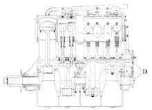 The cylinders were cast separately from iron and then machined. They were grouped together to a single block, joined at their cooling jackets by means of flanges and bolts. There were two side valves per cylinder, which were operated from the camshaft, which was located on the left side of the engine block and driven from the crankshaft by spur gears. All four cylinders were fed by a single carburettor. A single spark plug per cylinder was mounted above the inlet valve, with the magneto located at the control side of the engine, driven from the crankshaft via an intermediate spur gear.