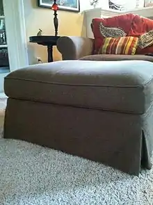 An ottoman is a piece of furniture.[1] Generally ottomans have neither backs nor arms. They may be an upholstered low couch or a smaller cushioned seat used as a table, stool or footstool. The seat may have hinges and form a lid for the inside hollow, which can be used for storage of linen, magazines or other items, making it a form of storage furniture.[2][3] The smaller version is usually placed near to an armchair or sofa as part of living room decor or may be used as a fireside seat.[4]