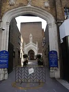 The original parish church of Our Lady of Victories was designed by noted architect George Goldie.[2] His grandson Joseph Goldie would later design the entrance screen.[3] The church opened on 2 July 1869, the Feast of the Visitation, taking over the congregation of St. Mary's Roman Catholic Chapel, Holland Street.[4] It became the pro-cathedral of the Archdiocese of Westminster as Cardinal Manning wished for a site more central than St. Mary Moorfields.[2] Our Lady of Victories served as the pro-cathedral until Westminster Cathedral opened in 1903.[5]