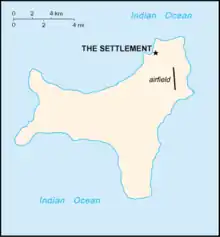Christmas Island is a small territory of Australia located in the Indian Ocean, 2600 kilometres (1600 mi) northwest of Perth in Western Australia, 500 kilometres (300 mi) south of Jakarta, Indonesia, and 975 km ENE of the Cocos (Keeling) Islands.[1] Christmas Island supports about 1,600 residents, who live in a number of "settlement areas" on the northern tip of the island: Flying Fish Cove (also known as Kampong), Silver City, Poon Saan and Drumsite.