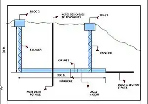 A separate entry block was planned, adjacent to the Villy Est casemate. The underground gallery system at La Ferté is simple, limited to a gallery linking the two blocks, which were initially designed to function as separate units with separate generating plants and ventilation facilities in each block. The 275-metre (902 ft) gallery contained some shared facilities, such as a kitchen, a laundry and an infirmary, at an average depth of 24 metres (79 ft) below the surface. The gallery's small size made it most useful as a link, rather than as the garrison, magazine, command post and long-term shelter afforded by the gallery systems of most Maginot ouvrages. Unlike most ouvrages, La Ferté's living spaces were near the surface in the two combat blocks.[5] A more typical Maginot position would have such spaces under 30 metres (98 ft) of earth or rock cover.[12] Unlike many Maginot positions, the main drain at La Ferté was not configured as an emergency exit.[5] The mixed-arm turret used on Block 2 was known to be mechanically trouble-prone, and La Ferté's turret particularly so.[13]