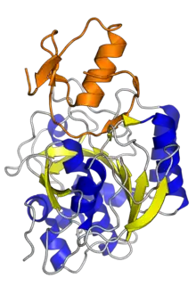 The third Kazal domain of the turkey ovomucoid protein (orange) bound to subtilisin Carlsberg, a serine protease.[1]