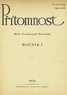Přítomnost was started in 1924.[1] It was able to come into existence thanks to T. G. Masaryk (first Czechoslovakia's President), who at the time was financially supporting young journalist Ferdinand Peroutka. The magazine gained a notable reputation and became one of the most respected political publication of its time. A large number of democratically minded authors such as Karel Čapek, Milena Jesenská, Eduard Bass, Karel Poláček, Richard Wiener, Václav Černý, Otokar Fischer contributed to Přítomnost. Politician and publisher Jaroslav Stránský was the magazine's publisher.