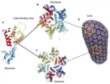 - ↑ Du S, Betts L, Yang R, Shi H, Concel J, Ahn J, et al. (February 2011). "Structure of the HIV-1 full-length capsid protein in a conformationally trapped unassembled state induced by small-molecule binding". Journal of Molecular Biology. 406 (3): 371–386. doi:10.1016/j.jmb.2010.11.027. PMC 3194004. PMID 21146540.