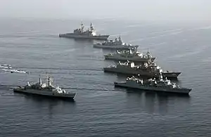 PNS Khaibar (DDG-183) (first vessel on bottom on the left) assemble in a formation led by the German frigate Augsburg participating in the Combined Task Force-150 in the Indian Ocean in 2004.