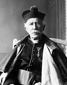 The Apostolic Vicar of Herzegovina, Bishop Anđeo Kraljević died on 27 July 1879 while on a visit to distribute chrism oils to Konjic.[27][41] Herzegovinian Franciscans chose Buconjić as his successor.[27][42] Due to his loyalty to Austria-Hungary, the Austrian-Hungarian authorities lobbied for Buconjić to succeed Bishop Kraljević with a recommendation from the apostolic vicar of Bosnia, Bishop Paškal Vuičić.[43] His appointment was approved by both, the Austrian-Hungarian government as well as Apostolic Nuncio to Austria-Hungary Domenico Jacobini.[27] Pope Leo XIII approved Buconjić's nomination and issued two decrees on 30 January 1880 appointing Buconjić the apostolic vicar and a titular bishop of Magydus.[27][44] To enhance the connection between Herzegovina and Croatia,[6] Buconjić chose Zagreb as a place for his episcopal consecration.[27] Buconjić was consecrated a bishop by the Archbishop of Zagreb Cardinal Josip Mihalović in Zagreb on 19 March 1880, after which Buconjić visited the emperor in Vienna and the pope in Rome.[17][27] Buconjić was finally installed as the apostolic vicar on 25 April 1880.[27][45] His episcopal motto was "All for the faith and homeland".[17]