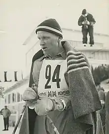 Paavo Jaakko Matias Korhonen (5 June 1928 – 29 September 2019)[1] was a Finnish Nordic skier who won the individual titles at the 1957 Holmenkollen ski festival and 1958 FIS Nordic World Ski Championships. He competed at the 1952, 1956 and 1960 Olympics and placed fourth, fourth and ninth, respectively. At the 1952 games he also finished 14th in the 18 km cross-country skiing race, and in 1960 served as the Finnish Olympic flag bearer at the opening ceremony.[2][3] Korhonen lived in his home town of Joutseno, where a statue is erected in his honor.