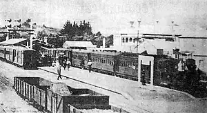 The first station was opened on 20 December 1895 by the local MP and Railways Minister, Alfred Cadman, when the line was extended 22.52 km (13.99 mi) from Te Aroha.[1] It was at the north end of the main street, between Belmont Road and Railway Street.[2] A coal shed and telephone office were added in 1896, when the special station also had a platform, cart approach, 40 ft (12 m) x 30 ft (9.1 m) goods shed, loading bank, cattle yards, engine turntable and shed, stationmaster's house, urinals and a passing loop for 44 wagons. The station was improved in 1897, including access to a refreshment room, gas lighting in 1899 and a bookstall in 1910. A new turntable in 1900 allowed use of J Class engines.[3]